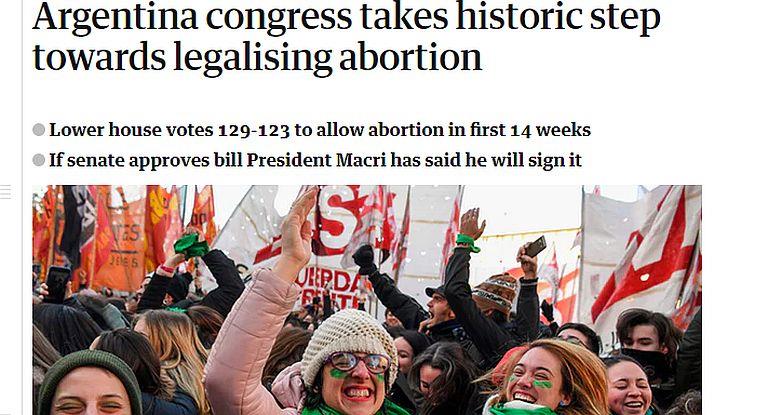 "El Congreso argentino dio un hist贸rico paso hacia la legalizaci贸n del aborto", titul贸 el brit谩nico The Guardian.