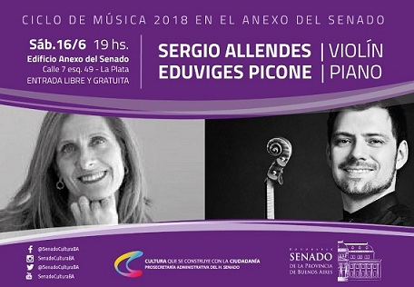Con la presencia de de Eduviges Picone en piano y Sergio Allendes en violĂn continĂşa el "Ciclo MĂşsica en el Anexo del Senado 2018". El recital será este sábado 16 de junio a las 19 hs. en el Edificio Anexo del Senado de la Provincia de Buenos Aires sito en avenida 7 esquina calle 49 de La Plata; siendo la entrada libre y gratuita.