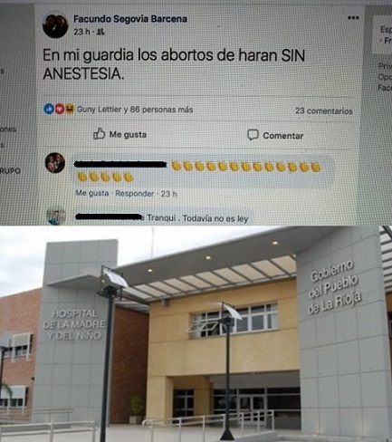 | El Ministerio de Salud de La Rioja repudió los dichos de un profesional del Hospital de la Madre y el Niño y la institución decidió "desafectarlo" de manera inmediata, informó un comunicado conjunto de esa cartera y el centro médico público. "Repudiamos totalmente los dichos expresados por un médico anestesiólogo de dicha institución, por lo cual se decidió de manera inmediata, desafectar al profesional del hospital y elevar una comunicación a la Asociación de Anestesia de la Provincia, Consejo de Médicos y Colegio Médico de la Provincia", según el comunicado emitido el viernes por esa cartera. "La ministra de salud, Judit DÃaz Bazán, el subsecretario Luis Bazán, el director ejecutivo del Hospital Materno, Francisco Sosa, y la directora médica Liliana Galleguillo le dicen NO a la violencia obstétrica institucional", agregó el texto. |