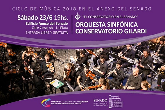 Este próximo sábado 23 bajo la presentación de "El Conservatorio en el Senado",  la Orquesta Sinfónica del Conservatorio Gilardi, con la dirección de Leandro Valiente. Será a las 18 hs. en el Edificio Anexo del Senado bonaerense sito en Avenida 7 esquina 49 a las 19 hs. con entrada libre y gratuita.