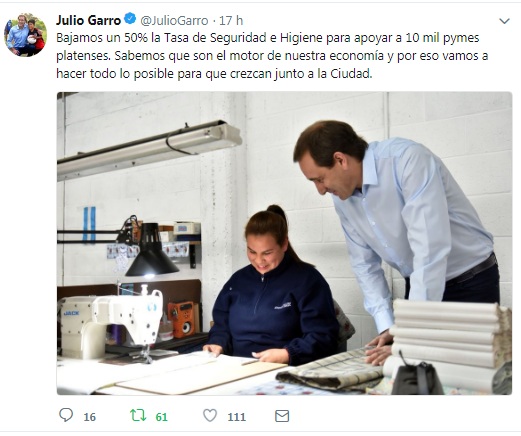 A trav茅s de un anuncio que encabez贸 el intendente local, Julio Garro; el Municipio comunic贸 la reducci贸n del 50% de la Tasa de Seguridad e Higiene para peque帽os contribuyentes durante la segunda mitad del 2018. El Jefe Comunal promocion贸 fuertemente el anuncio por las redes sociales y el "important铆simo mensaje" puede verse por CAGL.tv.