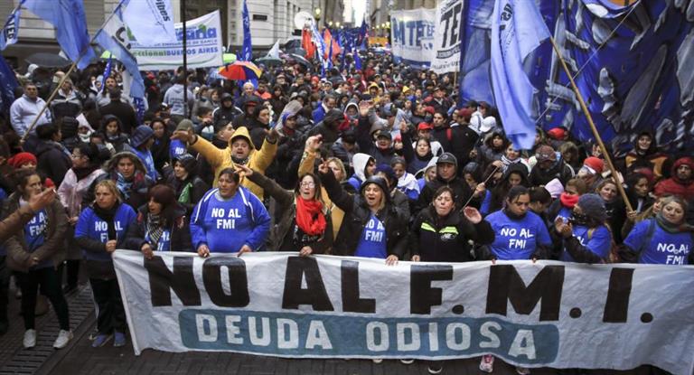 Sindicatos y movimientos sociales marcharon el viernes desde la Avenida 9 de Julio hasta las puertas del Banco Central en la city porteña para manifestar su repudio a la presencia en el paÃs de la titular del FMI, Christine Lagarde, y al acuerdo de financiamiento que firmó el Gobierno con el organismo multilateral. De la manifestación participaron dirigentes e integrantes de gremios como CTERA, Camioneros, Asociación Bancaria; de las organizaciones sociales Movimiento Evita, Corriente Clasista y Combativa y Barrios de Pie; y de la agrupación kirchnerista La Cámpora. En una jornada frÃa y bajo una persiste lluvia, algunas agrupaciones concentraron desde el mediodÃa en el Obelisco, pese a que la marcha principal fue convocada para las 18. La sede del Banco Central fue elegida ya que el primer desembolso (15.000 millones de dólares) del préstamo del FMI acordado con la gestión de Mauricio Macri se está liquidando a razón de 100 o más millones de dólares diarios a través de la subasta que realiza el propio BCRA. Una vez en las puertas del edificio ubicado en Reconquista 266, se procedió a la lectura completa de la carta dirigida a Lagarde que difundieron dÃas atrás estos mismos sectores con duras crÃticas al acuerdo con el Fondo, y que fue publicada en la página web change.org para sumar adhesiones. En el texto, los dirigentes opositores calificaron al préstamo del FMI como "odioso o execrable", sostuvieron que "buscar el equilibrio fiscal ajustando el gasto social conduce al debilitamiento del mercado interno" y advirtieron sobre "la explosiva situación social que vive la Argentina y que seguramente se agravará a medida que se apliquen las medidas pactadas". Tras la lectura de la misiva, los dirigentes e integrantes de esas agrupaciones cantaron el Himno Nacional y se despidieron al grito de "Patria si, colonia no". También estuvieron presentes los sindicalistas docentes Roberto Baradel y Hugo Yasky; el metrodelegado Roberto Pianelli; el número tres de Camioneros, Omar Pérez; los referentes de la CTEP, Juan Grabois y Esteban Castro; de Barrios de Pie, Daniel Menéndez; de La Cámpora, Andrés Larroque; y de Nuevo Encuentro, MartÃn Sabbatella. El dÃa anterior, el triunvirato de la CGT habÃa realizado una conferencia de prensa para también manifestar su rechazo al acuerdo con el FMI, ya que consideró "inviable" el ajuste planteado y vaticinó que "va a abrir un frente de conflicto infinito". En tanto, este sábado a las 11 partidos y agrupaciones de izquierda harán su propia protesta contra la visita de la presidenta del FMI, concentrando en la esquina de las avenidas Las Heras y Pueyrredón para desde allà marchar hacia Centro de Exposiciones y Convenciones de Buenos Aires, donde Lagarde y el ministro de Hacienda, Nicolás Dujovne, darán una conferencia de prensa conjunta. La movilización fue convocada por el Frente de Izquierda y con referentes del espacio como Nicolás del Caño, Myriam Bregman y Christian Castillo, quienes en la previa difundieron un comunicado en el que denunciaron que Lagarde "viene a refrendar el plan de miseria social y entrega nacional que ha pactado con el Gobierno de Macri". |