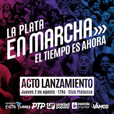 Este jueves 2 de agosto a las 17 en el Club Platense ubicado en 21 entre 51 y 53; se presenta ante la sociedad platense el Frente "En Marcha". Se trata del "Frente" integrado por Movimiento Evita, Libres del Sur, Partido del Trabajo y del Pueblo, Unidad Popular, Izquierda Popular y Vamos que realizará el primer acto en La Plata como fuerza polÃtica.