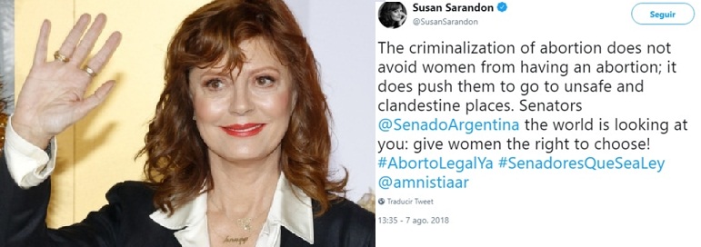 | A un d铆a de que el Senado argentino debata el proyecto por la interrupci贸n voluntaria del embarazo, que tiene media sanci贸n en Diputados, las voces internacionales sobre el tema se siguen multiplicando. A la contratapa de la edici贸n internacional del New York Times publicada hoy, con un contundente mensaje por la legalizaci贸n del aborto, en un aviso de Amnist铆a Internacional, se sum贸 en las 煤ltimas horas una manifestaci贸n p煤blica de Susan Sarandon. La c茅lebre actriz estadounidense, recordada por su extensa carrera en cine y teatro y una de las figuras m谩s salientes de Hollywood, escribi贸 en su cuenta de Twitter un mensaje a los senadores argentinos. "La criminalizaci贸n del aborto no evita que las mujeres tengan abortos; las obliga a ir a lugares inseguros y clandestinos. Senadores @SenadoArgentina el mundo los est谩 mirando: denles a las mujeres el derecho a elegir! #AbortoLegalYa #SenadoresQueSeaLey @amnistiaar", escribi贸 la protagonista de Thelma y Louise y Mientras est茅s conmigo. Conocida por su activismo y sus frecuentes manifestaciones a favor de los derechos de las mujeres, la actriz interpel贸 de ese modo a los legisladores de la C谩mara alta argentina, quienes debatir谩n ma帽ana, desde las 10:30, el proyecto de ley aprobado previamente por Diputados. |