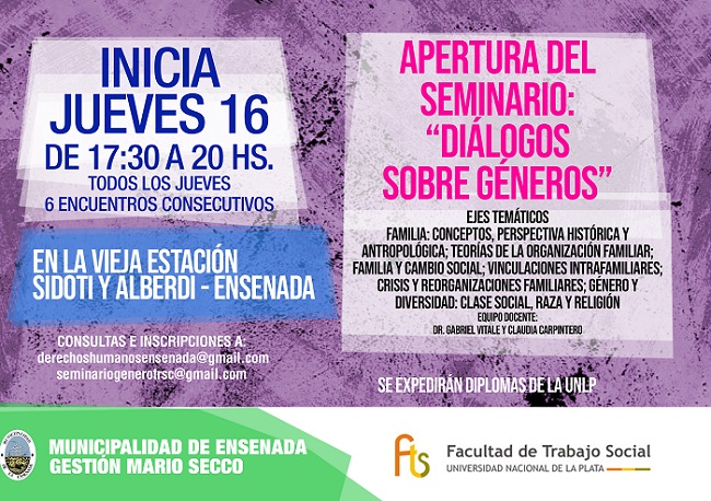 Este jueves 16 iniciará un nuevo Seminario organizado en forma conjunta entre la Municipalidad de Ensenada y la Facultad de Trabajo Social de la Universidad Nacional de La Plata. Serán seis encuentros consecutivos donde se pondrán en tensión conceptos como familia, género y diversidad. Las charlas se realizarán en el Centro Cultural La Vieja Estación de 17:30 a 20 y se expedirán certificados de la UNLP. Para más información e inscripciones enviar un correo a derechoshumanosensenada@gmail.com o a seminariogenerotrsc@gmail.com |