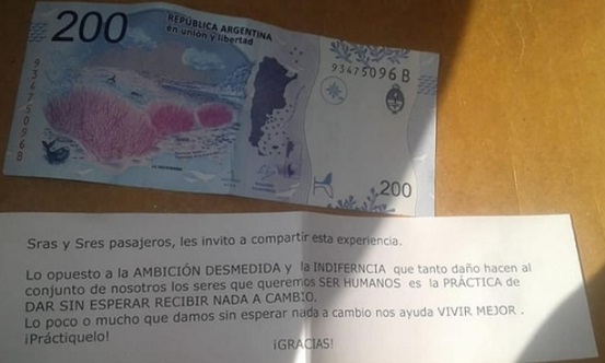 Los que agarraron el papel, adem谩s de los 200 pesos, se encontraron con la nota que dec铆a: "Se帽oras y se帽ores pasajeros, los invito a compartir esta experiencia. Lo opuesto a la ambici贸n desmedida y la indiferencia, que tanto da帽o hace a los seres que queremos ser humanos, es la pr谩ctica de dar sin esperar nada a cambio. Lo poco o mucho que damos sin esperar nada a cambio nos ayuda a vivir mejor. 隆Pract铆quenlo!".