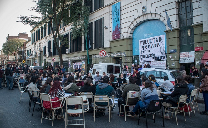 aumentos salariales de 2018. Como parte de la toma, alumnos cortaron la calle Puán, donde se encuentra la sede, y sacaron los pupitres a la vereda. De esa forma intentaron continuar con el programa educativo normalmente, a través de una jornada de clases públicas. Cuando se recorrió el lugar en la mañana de este miércoles, se llevaban a cabo cinco clases de distintas materias de algunas de las carreras que se dictan en esa facultad. Un grupo de alumnos habÃa armado varios cÃrculos con sillas, a lo largo de la calle, para escuchar al profesor, a pesar del frÃo y del ruido de los autos. Dentro de la sede la situación era completamente distinta. El segundo y el tercer piso de la facultad se veÃan bloqueados por barricadas hechas de sillas y la mayorÃa de las aulas estaban vacÃas. Algunas de ellas fueron ocupadas por estudiantes con bolsas de dormir, y en otras faltaba casi todo el mobiliario. Tanto en la puerta del edificio como en las paredes de su interior, el Centro de Estudiantes pegó carteles con consignas de la protesta y con los horarios de las clases públicas. "Esta es una respuesta al ataque del Gobierno contra la educación pública. Porque acá no sólo se está atacando al sueldo de los maestros sino que también a todo el sistema educativo", señaló Santiago, uno de los estudiantes de la toma. En ese mismo tono opinó Florencia, que es estudiante de Letras: "No podemos permitir que se lleve adelante este ajuste. Por eso mañana a las nueve vamos a cortar Directorio, a la altura de Puán, para sacar las aulas otra vez a la calle", dice. La toma durará hasta este jueves, dÃa en el que se realizará una marcha del Congreso de la Nación a Plaza de Mayo junto a los gremios docentes, para reclamar aumentos salariales y mejores polÃticas educativas. "Esperamos que en los próximos dÃas se sumen más facultades a esta lucha", señaló Santiago, quien no descarta que la toma se extienda más allá del jueves. (C) |