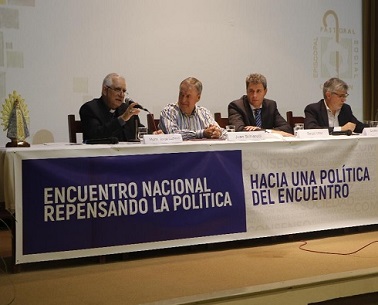 Emilio Inzaurraga, actuando como moderador, dijo: "Cuando hablamos de repensar nos disponemos a volver a hacerlo, a reflexionar, a discernir, abiertos a la novedad y sabiendo la experiencia democrática de nuestro querido país. Este primer panel tiene por titulo "La Cultura del Encuentro y de la Solidaridad, un desafío social". las propuestas centrales las van a hacer los dos gobernadores".