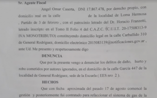 El secretario de Planificaci贸n de Obras, Infraestructura y Servicios P煤blicos, Marcelo Basilotta, realiz贸 una denuncia ante la Fiscal铆a N掳10 del Departamento Judicial Moreno-General Rodr铆guez, por robo y destrozos en la Escuela de Educaci贸n Media (EEM) N掳2 "Jos茅 Hern谩ndez".