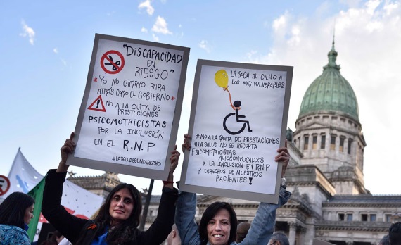 Organizaciones sociales y polÃticas, asociaciones y ONG que luchan por los derechos de las personas con discapacidad se concentraron en el Congreso para manifestarse en contra del recorte que el Gobierno nacional pretende realizar sobre las pensiones por discapacidad. Agitaban sus banderas y carteles bajo las consignas: "No a la quita de pensiones"; "Un derecho no es un gasto"; "No al ajuste en discapacidad".