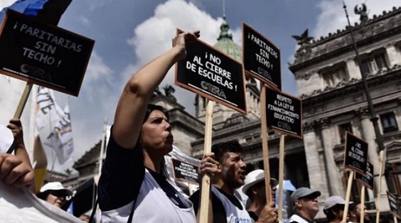| Los docentes bonaerenses iniciaron un nuevo paro de 48 horas en rechazo a la decisi贸n del gobierno provincial de imponer la suba del 11% que fue rechazada en la 煤ltima reuni贸n paritaria y no seguir negociando. La medida de fuerza es realizada por los gremios que integran el Frente de Unidad: FEB, SUTEBA, SADOP, AMET y UDOCBA, e incluir谩 una marcha a la gobernaci贸n bonaerense en la localidad de La Plata los m茅dicos de la CICOP y los judiciales de la AJB, dos gremios que tampoco cerraron paritaria con el gobierno, y con ATE.. Al anunciar la medida, la presidenta de la FEB, Mirta Petrocini, sostuvo que "la paritaria no es paritaria" con el gobierno provincial. "Nos citan a un d铆a y una hora y nos notifican lo que ofrecen: no es una discusi贸n, es un tr谩mite", grafic贸. La dirigente habl贸 de la oferta recibida en la 煤ltima reuni贸n con el gobierno y reiter贸 que estuvieron cerca de acordar y que, si no ocurri贸, fue por la "cerraz贸n" de los funcionarios. "Nos ofrecieron un 11% a cobrar en noviembre. Nosotros propusimos cobrarlo en octubre y una cl谩usula de reaseguro. Todo lo que hicieron los ministros fue retirarse". "No tienen que ponerse de acuerdo con los gremios, tienen que darle una respuesta a los trabajadores y a los jubilados. Esta fue la vez que estuvimos m谩s cerca. Lamentamos la cerraz贸n del gobierno", cerr贸. El titular de UDOCBA, Miguel D铆az, sostuvo que el gobierno "tiene que terminar con el decretismo absoluto" al tiempo que explic贸 por qu茅 una suba del 30% no alcanza: "Estamos a octubre con una inflaci贸n de 5 puntos y estamos previendo una inflaci贸n del 45% a diciembre con una recuperaci贸n salarial del 30%. Ac谩 va la inflaci贸n por el ascensor y los sueldos por la escalera". "Desde el gobierno dec铆an que no ten铆an un peso y en dos semanas llegamos a un 30% de recuperaci贸n del salario, con lo cual queda claro que el gobierno miente", complet贸 antes de advertir que los docentes en las asambleas de cada escuela propusieron medidas de fuerza hasta por 96 horas. Por 煤ltimo, el titular de SUTEBA, Roberto Baradel, le pidi贸 a la gobernadora "que se haga cargo de las escuelas, los hospitales y los juzgados". Tambi茅n se mostr贸 en contra de la municipalizaci贸n del Servicio Alimentario Escolar (SAE) que se brinda en los comedores escolares. "Hay convenios que se est谩n firmando para transferir la infraestructura y los comedores a los municipios. Eso es responsabilidad de la Provincia. Rechazamos cualquier intento de este tipo", se帽al贸. (tAr) |