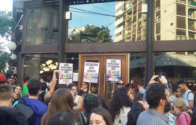 Una multitud se reuni贸, este s谩bado, afuera de la reconocida cadena de pizzer铆as Accademia della Pizza, ubicada en Scalabrini Ort铆z y Santa Fe para repudiar el episodio de violencia homof贸bica que sufri贸 una pareja el pasado 21 de agosto.