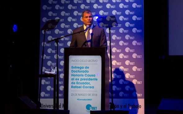 El exmandatario llegó el jueves 22 a la Argentina y entre Santa Fe y Buenos Aires trajinó una agenda muy nutrida, que incluyó otro doctorado Honoris Causa (el de la Universidad Nacional de Rosario) y encuentros con dirigentes como Agustín Rossi, Hebe de Bonafini y Cristina Fernández de Kirchner. Durante la disertación en la UMET sintetizó su formación académica y su experiencia política, y en una clase de economía heterodoxa explicó el carácter del neoliberalismo actual y el rol de América Latina en ese escenario complejo bajo la restauración de gobiernos conservadores. Para caracterizar la fase anterior al nuevo avance de la derecha, Correa citó a Cristina Fernández: "Fueron años en los que por primera vez los presidentes nos parecíamos a nuestros pueblos. No teníamos cuentas offshore ni plata en paraísos fiscales. Ese rasgo era todo un signo de los tiempos que corrían, diferentes y opuestos a los tiempos que hoy imperan, donde los presidentes se parecen demasiado a los dueños tradicionales de nuestros países, a sus más rancias oligarquías".