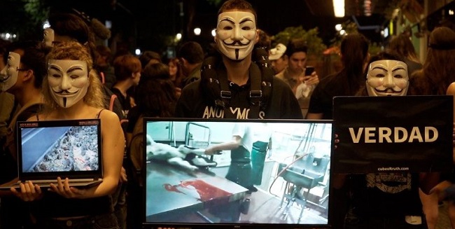 Quienes pasaron por allí se cruzaron con jóvenes vestidos de negro y con sus rostros cubiertos con las máscaras que popularizó la película V de Vendetta. Pertenecen a Anonymous for the Voiceless, otra de las agrupaciones que organizaron el Encuentro. Y están allí con pantallas que muestran sin filtros lo que ocurre en granjas y mataderos.