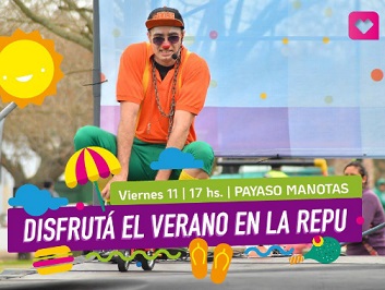 En el d铆a de hoy, ser谩 el turno del reconocido Payaso Manotas, que llega con una obra de clown, circo y humor para toda la familia. El atractivo unipersonal combina malabares, magia, equilibrio, minibicicleta, escapismo y burbujas de todo tipo y tama帽o. Las funciones ser谩n los d铆as: viernes 11 y 18 de enero; viernes 1 y 8 de febrero y domingo 24 de febrero, a las 17 horas.