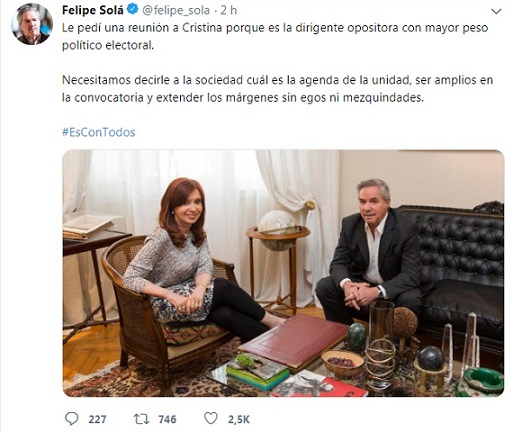 Felipe Solá, desde la red social Twitter, a través de su cuenta @felipe_sola posteó: "Le pedà una reunión a Cristina porque es la dirigente opositora con mayor peso polÃtico electoral. Necesitamos decirle a la sociedad cuál es la agenda de la unidad, ser amplios en la convocatoria y extender los márgenes sin egos ni mezquindades".