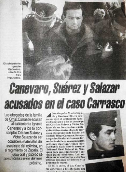 A Carrasco el subteniente Ignacio Canevaro lo bailó por lo menos durante 20 minutos. Dos soldados más antiguos, VÃctor Salazar y Cristian Suárez, le escondieron el lampazo con el que debÃa limpiar. Omar era blanco de bullying. Y del militar. Ellos fueron los últimos que lo vieron con vida y fueron detenidos e incomunicados por la justicia militar. La otra, la de todos, estaba en manos del juez Rubén Caro.