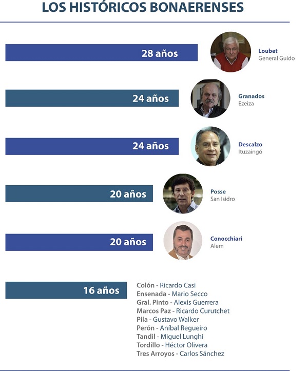 Que "la gente me lo pide"; que "nos quedan muchas cosas por hacer"; que "me encanta la gestión"; que "si el partido lo requiere". Dejar el poder no es fácil, y los intendentes de la provincia de Buenos Aires saben de eso. Ya metidos en la recta final de cara a la campaña de este año, seis de cada diez alcaldes ya confirmaron que buscarán la reelección en las urnas. Tanto para los que llegaron al poder hace más de dos décadas como para los que lo hicieron en 2015, octubre será la última oportunidad de estar en el sillón local de manera ininterrumpida. Es que a partir de la entrada en vigencia de la Ley 14.836, se puso fin a la reelección indefinida para los alcaldes, y también limitó a sólo dos los mandatos posibles de concejales, legisladores y consejeros escolares. Todos esos cargos sólo podrán ejercerse por dos perÃodos seguidos. Frente a este panorama y ante la estrategia que cada fuerza decida para enfrentar las elecciones provinciales y nacionales, son muchos los intendentes que jugarán en sus distritos por última vez. Algunos, que hace años gobiernan, porque saben que un impase posiblemente ya los alejará definitivamente del poder. Otros, en cambio, que dudaban en presentarse, son impulsados desde sus partidos para buscar traccionar "hacia arriba" en las boletas. Si bien hasta ahora y a tres meses del cierre de listas alrededor de 75 de los 135 intendentes ya confirmaron su intención de ir por un nuevo perÃodo, es probable que más cerca de junio el número aumente. De hecho, históricamente fue asÃ. En 2015 fueron 99 los jefes comunales que buscaron la reelección (58 la consiguieron), mientras que en 2011, un total de 112 se presentaron en las urnas. Y el resultado los avaló, ya que sólo 14 no consiguieron su objetivo. El que aún no definió su futuro polÃtico es el intendente récord con más periodos al frente de una comuna: el radical AnÃbal Loubet de General Guido, quien lleva 28 años ininterrumpidos al frente de la gestión. "Me tiro más por el no, pero por una cuestión personal. Aún no está la decisión tomada; en abril lo vamos a definir. Las decisiones son orgánicas y hay que analizar el contexto polÃtico", dijo. Y admitió que si bien la sucesión serÃa difÃcil porque "no hay un candidato natural", si apareciera un postulante "para ganar bien, darÃa un paso al costado" tras casi tres décadas. Y el dirigente de 66 años agregó: "Me encanta la gestión, si me alejara lo harÃa por cuestiones familiares". Otro histórico, con 24 años en el cargo es Alejandro Granados, quien está al frente de Ezeiza desde la creación de ese partido, y todo indica que buscará un séptimo mandato. Sólo se ausentó dos años, cuando fue ministro de Seguridad de Daniel Scioli desde agosto de 2013 hasta diciembre de 2015. En el mismo lugar está Alberto Descalzo, de Ituzaingó, también alcalde de ese municipio desde su creación en 1995. Su futuro polÃtico no está tan claro, aunque todo indica que también jugará. Continuidad "Cuando me preguntan si quiero ser candidato a gobernador o vicegobernador yo les digo que quiero ser intendente", dijo dÃas atrás Mario Secco, que desde 2003, y siempre dentro del kirchnerismo, ganó todas las elecciones en Ensenada. Es uno de los dirigentes más cercanos a Cristina, como Jorge Ferraresi (Avellaneda, dos perÃodos) y Pablo Zurro (Pehuajó, tres perÃodos), que seguramente estarán en la pelea. Otro "K duro" es Alberto Conocchiari (Alem, cinco perÃodos), que duda sobre si se presentará. También con 16 años está Alexis Guerrera (General Pinto), quien si bien no decidió si buscará un quinto mandato, reconoció que lo definirá en mayo junto a la estrategia de su partido, Alternativa Federal. "Cuando uno pertenece a un espacio polÃtico no sólo se toman las decisiones por lo que uno tiene ganas o quiere hacer, sino por lo que es mejor para el conjunto", expresó Guerrera. "Motivaciones hay, la tarea de servir a la comunidad siempre me ha resultado gratificante, pero también pesan otros factores, que a medida que pasa el tiempo se ponen cada vez más en consideración", admitió. Otros con 16 años en el poder y que buscarán otro perÃodo son AnÃbal Regueiro (Presidente Perón), Gustavo Walker (Pila), Héctor Olivera (Tordillo) y Miguel Lunghi (Tandil), un histórico del radicalismo ortodoxo que probablemente tenga una dura interna con el titular del Concejo y lÃder del PRO, Marcos Nicolini. En tanto, el otro con cuatro perÃodos es el mandamás de Tres Arroyos, el vecinalista Carlos Sánchez, quien sorprendió al sugerir que no buscará la reelección en su discurso en la Fiesta provincial del Trigo. Sin embargo, luego no quiso confirmar que se bajará y dejó asà abierta la posibilidad de competir en octubre. De los trece alcaldes que llevan doce años en el poder, la mayorÃa encabezará las boletas, y sólo un puñado dejarán el lugar a otro dirigente. Son Gustavo Arrieta (Cañuelas); Oscar Ostoich (Capitán Sarmiento), Marcelo Skansi (Carmen de Areco); Luis Etchevarren (Dolores); Fernando Gray (EcheverrÃa); Juan Carlos Veramendi (Gral. Paz); Aldo Fisher (Laprida); AnÃbal Rappallini (Maipú); Juan Pablo de Jesús (La Costa); Pablo Zurro (Pehuajó); Miguel Gargaglione (San Cayetano); Gustavo Cocconi (Tapalqué) y Osvaldo Cáffaro (Zárate). La "alternancia familiar" Un dato que llama la atención y que muestra la tentación de ser reelegido es que desde 1983 hasta la actualidad, sólo un municipio no vio repetir un intendente. Aunque vale aclarar: se trata de Lezama, el último distrito creado y que hasta el momento tuvo dos jefes comunales. En el resto de los 134 municipios, hubo un intendente que como mÃnimo estuvo dos perÃodos. Sin embargo, hay casos en los 36 años de democracia que rompen todos los análisis y tienen que ver con la poca alternancia o, simplemente, la "alternancia familiar". El más llamativo es el sillón de San Isidro que lleva solamente el apellido Posse. Es que Mel