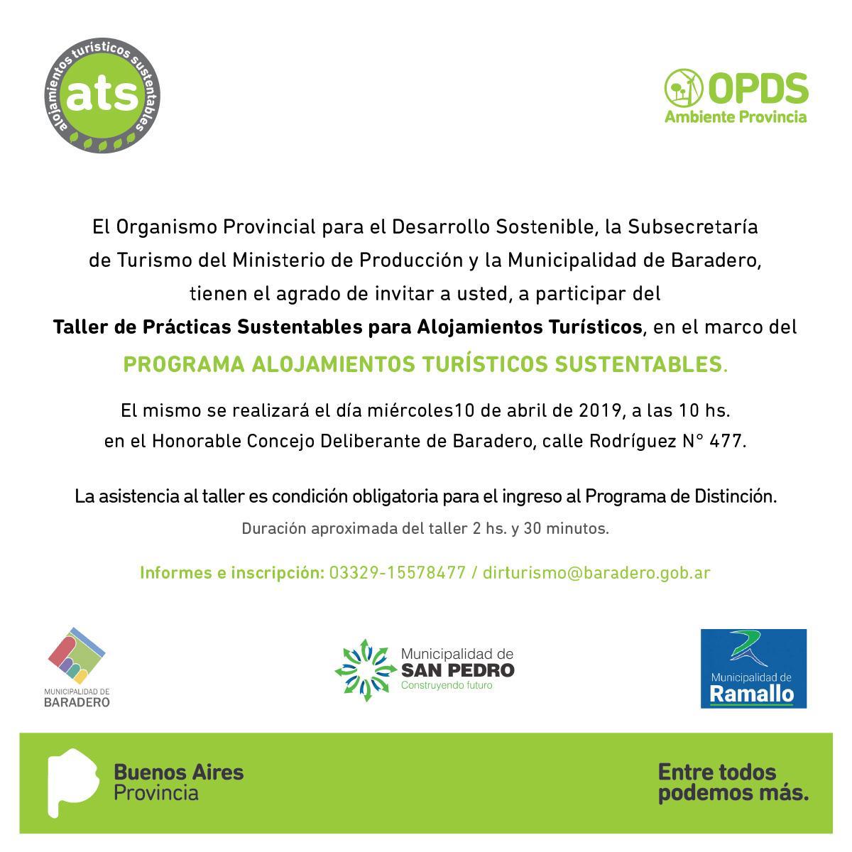 La Municipalidad de Baradero mediante el Organismo Provincial para el Desarrollo Sostenible y la SubsecretarÃa de Turismo del Ministerio de Producción tiene el agrado de invitar a usted a participar del Taller de Prácticas Sustentables para Alojamientos TurÃsticos en el marco del Programa Alojamiento TurÃsticos Sustentables. El mismo se realizará el miércoles 10 de abril de 2019 a las 10:00 horas en el salón del Honorable Concejo Deliberante (RodrÃguez 477). La asistencia al taller es condición obligatoria para el ingreso al Programa de Distinción. Su duración es aproximadamente de 2 horas y 30 minutos.