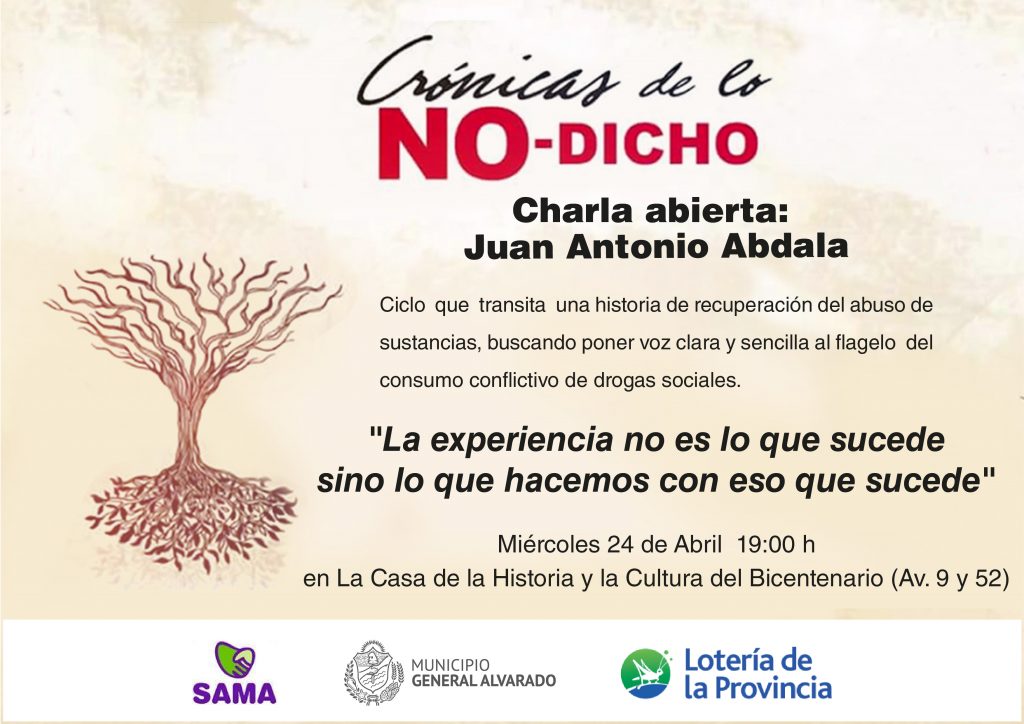 Este talentoso jugador, figura del Club Argentino de Junín (hay una tribuna en el club que lleva su nombre), con quien llego al Torneo Nacional Argentino en apenas tres años, cuenta su caída en la drogadicción, y lo que provoca en su carrera, su vida y sus proyectos. A través de la acción de comunidades terapéuticas, similares al Proyecto SAMA que desarrolla el Municipio de General Alvarado, logra recuperar en plenitud su vida, dando testimonio de su experiencia a través de su libro "Crónicas de lo No-Dicho", y de las charlas que lleva adelante para exponer su caso. Este Ciclo de charlas transita una historia de recuperación del abuso de sustancias, buscando a través del relato en primera persona, poner voz clara y sencilla a este flagelo social. La charla está dirigida a adolescentes y padres, con interacción de los asistentes como disparador de la temática del consumo y abuso de sustancia, y tiene varios ejes de contenido. Cuenta con el apoyo del Municipio de General Alvarado, SAMA, y Lotería de la Provincia. |