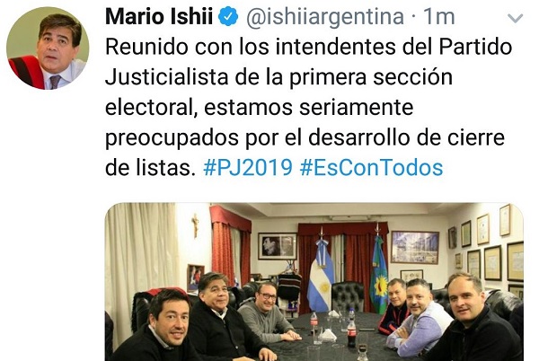 Intendentes de la Primera secci贸n electoral blanquearon las tensiones por el cierre de listas al interior del Frente de Todos y se mostraron "preocupados" por la falta de espacios para su sector. Quien expuso el malestar fue el jefe comunal de Jos茅 C. Paz, Mario Ishii, quien public贸 en Twitter una foto con otros colegas de la Primera secci贸n, en la que sostuvo que "estamos seriamente preocupados por el desarrollo del cierre de listas". En la imagen aparece Leonardo Nardini (Malvinas Argentinas), Gustavo Men茅ndez (Merlo), Santiago Maggioti (Navarro), y Mariano West (Moreno), entre otros. Tambi茅n particip贸, pero no se fotografi贸, Ricardo Curuchet, de Marcos Paz. Seg煤n trascendi贸, los jefes comunales analizaron qu茅 posici贸n tomar frente a lo que consideran una marginaci贸n en las listas, ante el avance de La C谩mpora y los lugares que exige el massismo. Incluso llegaron a pedir por internas para dirimir las candidaturas. Desde el kirchnerismo alegan que los armados seccionales responden a que los jefes comunales "alambraron" sus listas locales y rechazan las internas. En ese movimiento, razonan, ser铆a l贸gico que el resto de los dirigentes "cobren" en el plano seccional. M谩s tarde, Men茅ndez intent贸 poner pa帽os fr铆os, al sostener que las tensiones "son l贸gicas" porque "hay una determinada cantidad de lugares y sin much铆simos m谩s los grupos con intenciones leg铆timas de estar". "Lo que prima es conformar una fuerza que se imponga a quinees gobiernan. Lo importante es que en este espacio confluye el 90 o el 95% del campo popular, no creo que nadie quiera quedarse afuera", se帽al贸. (DIB)