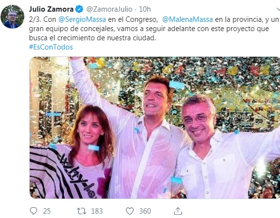 "Una vez m谩s, reafirmamos nuestro compromiso de seguir trabajando por un Tigre cada vez m谩s pujante e inclusivo, para el beneficio de todos nuestros vecinos", se帽al贸 Zamora en su cuenta de Twitter.