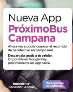 Presentan la nueva aplicación para celulares "Próximo Bus Campana" que les permitirá a los vecinos saber el recorrido del colectivo en tiempo real. Es una herramienta gratuita muy útil para los vecinos que utilizan el colectivo la cual que les garantizará comodidad, puntualidad y más seguridad; y les permitirá ver el recorrido en el mapa y las distintas paradas que se encuentran ubicadas a lo largo y ancho de la ciudad. Pueden descargarla en sus teléfonos celulares de manera gratuita desde el Play Store (para teléfonos con sistema operativo Android), mientras que en App Store (iPhone) estará disponible en las próximas semanas. |