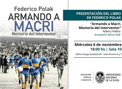 Este miércoles 6 de noviembre a las 18 hs. se presentará en la Universidad Nacional de La Plata el libro "Armando a Macri, memoria del interventor", de Federico Polak. Será en la sala 10 del edificio Sergio Karakachoff, de 48 entre 6 y 7.