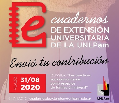 La revista "Cuadernos de Extensi贸n Universitaria de la UNLPam" (ISSN 2451-5930) de la UniversidadNacional de la Pampa (UNLPam) lanz贸 la Convocatoria 2020 a la presentaci贸n de contribuciones para su n煤mero 4 que ser谩 publicado en versi贸n digital, bajo un nuevo ISSN, que ya se encuentra en tr谩mite.