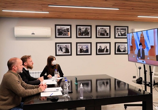 El intendente de Lomas de Zamora, Mart铆n Insaurralde y el presidente de la C谩mara de Diputados de la provincia de Buenos Aires, Federico Oterm铆n se reunieron v铆a zoom con el embajador de China en la Argentina, Zou Xiaoli.