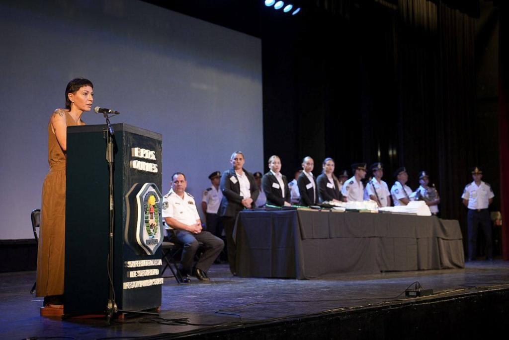 Por su parte, la subsecretaria de Articulaci贸n Institucional para la Seguridad bonaerense, Andrea Ballesteros, indic贸: "Simplemente, quiero agradecerles a todos ustedes que eligieron esta profesi贸n por la tarea diaria. Esta Polic铆a, que tiene m谩s de 200 a帽os, se form贸 con nuestra patria, y en todo ese tiempo, nos ca铆mos y nos levantamos, pero siguen ac谩, de pie. Les pido que sigan form谩ndose y que sigan siempre por el camino de la cercan铆a, que cada vez que tengan a alguien delante de ustedes piensen que puede ser de su familia y que lo traten como tal".