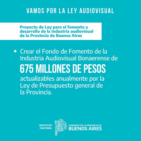 En su art铆culo 9, propone la creaci贸n de un Fondo de Fomento a la producci贸n audiovisual de 675 millones de pesos, que se actualizar谩 a帽o a a帽o por la Ley de Presupuesto de la Provincia, en funci贸n de la variaci贸n del valor de entradas promedio de cine establecido por el INCAA.
