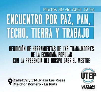 Este martes 30 de Abril, en vísperas del 1° de Mayo, Día del Trabajador se llevará a cabo el Encuentro Por Paz, Pan, Techo, Tierra Y Trabajo organizado por la Unión de Trabajadores y Trabajadoras de la Economía Popular ( UTEP), en el cual el Arzobispo de La Plata, monseñor Gabriel Mestre realizará la “bendición de herramientas de trabajo” que utilizan a diario las trabajadoras y los trabajadores de la economía popular de la zona. Dicha actividad se desarrollará en la plaza del barrio Las Rosas, ubicada en la Calle 159 esquina 514, a partir de las 12 y contará con la presencia, además de militantes de los movimientos sociales, de referentes políticos de la ciudad y de la CGT. Los organizadores remarcaron "la importancia de fortalecer estos espacios de unidad, donde confluyan distintos sectores de la comunidad, para dar el debate de cara a la sociedad sobre las dificultades económicas y sociales que producen las políticas deshumanizantes del gobierno liberal del presidente Javier Milei". |