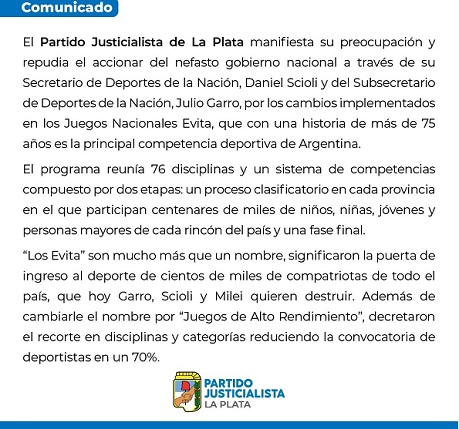 En el mismo repudiarion "el accionar del nefasto gobierno nacional a través de su Secretario de Deportes de la Nación, Daniel Scioli y del Subsecretario de Deportes de la Nación, Julio Garro, por los cambios implementados en los Juegos Nacionales Evita" y aseveraron que "'Los Evita' son mucho más que un nombre, significaron la puerta de ingreso al deporte de cientos de miles de compatriotas de todo el paÃs, que hoy Garro, Scioli y Milei quieren destruir".