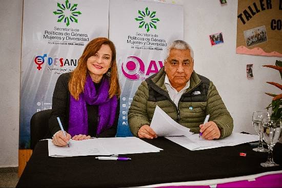 La ministra Estela Díaz, junto al intendente Cecilio Salazar, firmaron el acta de adhesión de San Pedro al programa “Municipios por la Igualdad” a través del cual se destinarán fondos provinciales para la construcción de un taller textil destinado a mujeres y diversidades en la delegación Los Cazadores.
