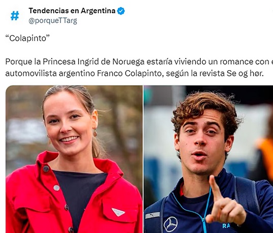 El tema estall贸 el s谩bado cuando algunos medios argentinos e internacionales que se hicieron eco citando como fuente al portal de noticias noruego Se og Hor como el que difundi贸 el rumor de una relaci贸n en secreto del piloto bonaerense de 21 a帽os con la joven de 20 quien ocupa el segundo lugar en la l铆nea de sucesi贸n al trono del pa铆s n贸rdico, despu茅s de su padre, el pr铆ncipe heredero Haakon Magnus, y por delante de su hermano menor, Sverre Magnus, y de su t铆a, la princesa Marta Luisa.