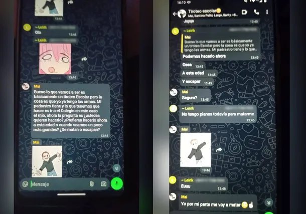 “Bueno, esto es asĂ. Vamos a entrar por la entrada principal como siempre y luego irán dos arriba y dos abajo… acá no es que ustedes elijan a quien mierda le van a disparar, persona que ven, persona que le disparan sin importar el que le toca. ÂżOkey? No quiero que se arrepientan a Ăşltimo momento. Si es asĂ crĂ©anme que no me gusta gastar mi tiempo. Ya sea estando en la escuela, lo siento mucho, pero los disparos no serán solo para los estudiantes, si no para el que se arrepiente tambiĂ©n”, expresa un mensaje en el grupo “Tiroteo escolar” donde hay cerca de 10 alumnos.