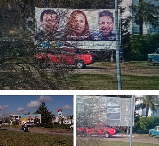 | La Plata: Banda del Frente de Todos rompió cartel de Garro / Santilli y puso gigantografía de Tolosa Paz y Arias | |||