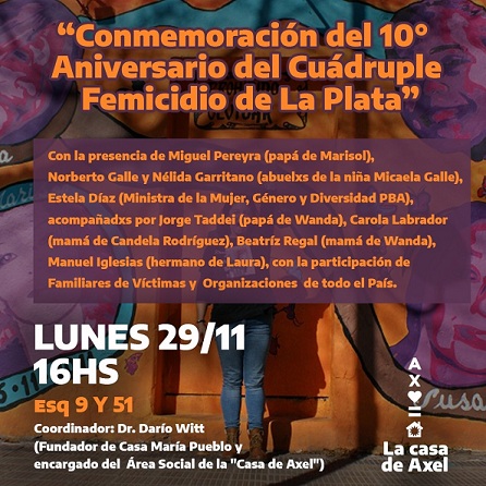 La noche del 26 al 27 de noviembre de 2011 ocurrió un hecho criminal conocido como "el cuádruple femicidio de La Loma", en el cual murieron asesinadas Susana de Barttole, de 63 años; su hija Bárbara Santos, de 29, y la hija de Bárbara y nieta de Susana, Micaela Galle, de 11 años, en un PH de la calle 28 al 467, entre 41 y 42 de La Plata, donde residían; más otra mujer que resultó ser Marisol Pereyra, de 35 años, amiga de Bárbara. Este lunes 29 de octubre a las 16 realizan actividad en la Casa de Axel, sita en calle 9 esquina 51 de La Plata para recordar a las víctimas y reclamar por justicia, ya que a entender de los familiares si bien hay un detenido con sentencia de prisión perpectua no estarían detenidos todos los involucrados en la realización del aberrante hecho.