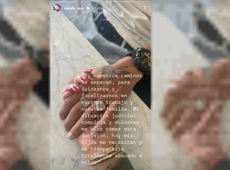 鈥淗oy nuestros caminos se separan, para cuidarnos y focalizarnos en nuestro trabajo y nuestra familia. Mi situaci贸n judicial compleja y dolorosa me hizo tomar esta decisi贸n, hoy mis hijos me necesitan y mi tiempo est谩 totalmente abocado a ellos鈥, expres贸 la medi谩tica tras haber realizado una serie de escraches a su ex pareja Mauro Icardi.
