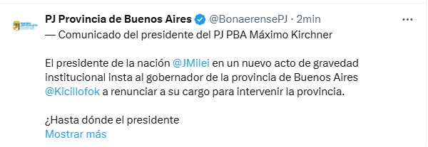 El presidente de la naci贸n @JMilei en un nuevo acto de gravedad institucional insta al gobernador de la provincia de Buenos Aires @Kicillofok a renunciar a su cargo para intervenir la provincia.